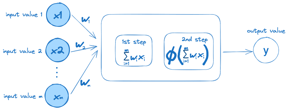 Summation and activation: The weighted inputs are summed, and an activation function is applied to the sum.