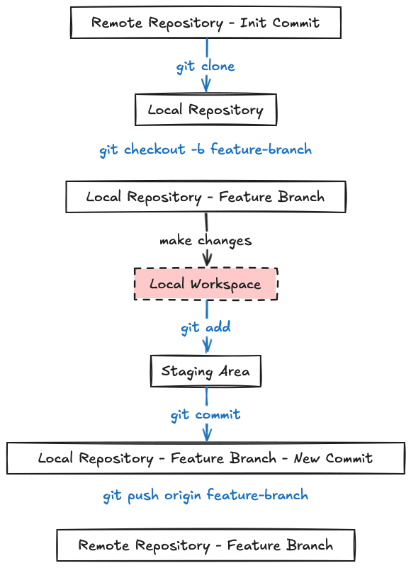 graph TD A[Remote Repository - Init Commit] A -->|git clone| B[Local Repository] B -->|git checkout -b feature-branch| C[Local Repository - Feature Branch] C -->|make changes| D[Local Workspace] D -->|git add| E[Staging Area] E -->|git commit| F[Local Repository - Feature Branch - New Commit] F -->|git push origin feature-branch| G[Remote Repository - Feature Branch]
