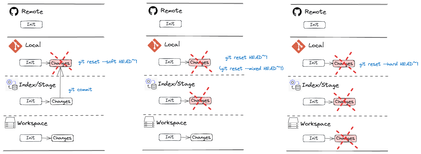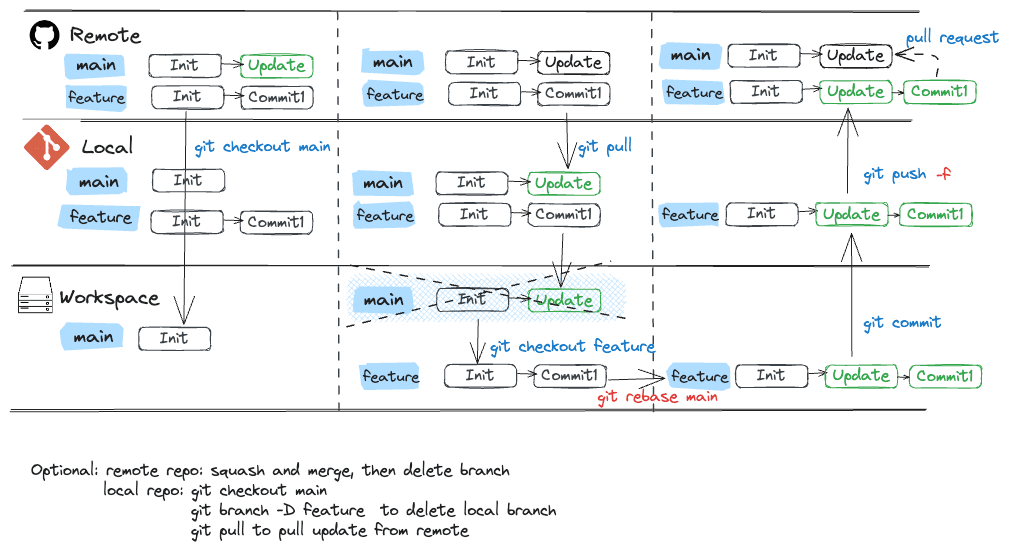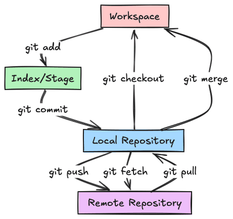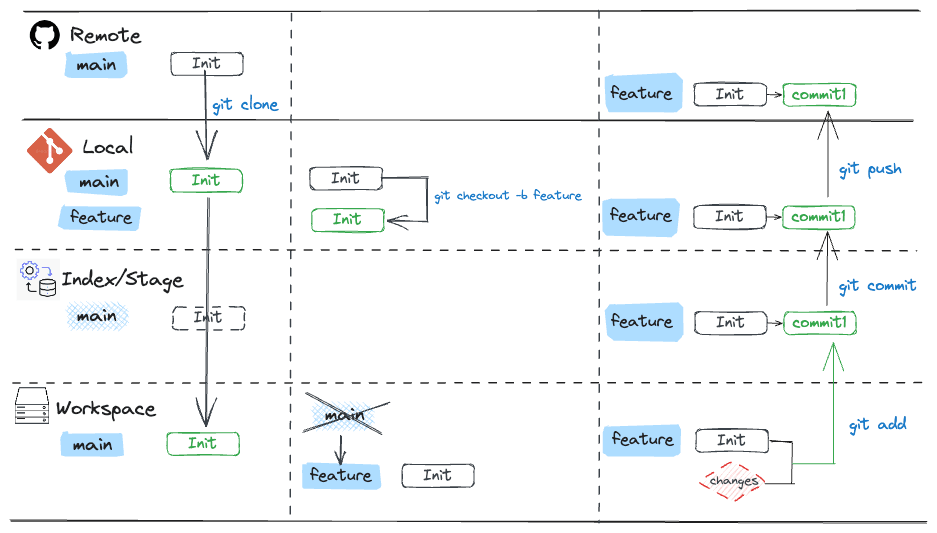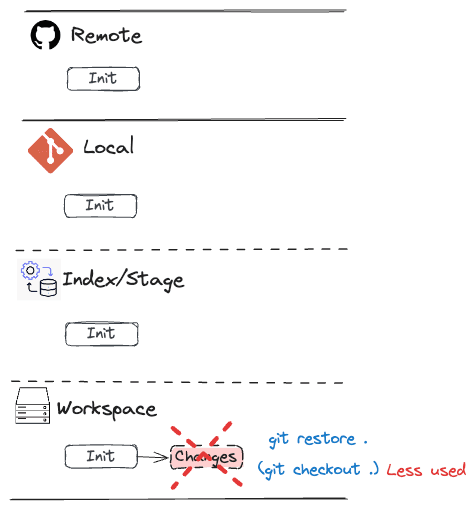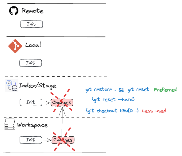 Having used Git for many years, I often find myself needing to revisit certain operations, especially when it comes to tasks like discarding changes across different areas (workspace, index/staging, local repo and remote repo). To streamline my workflow and make these operations easier to recall, I've compiled a collection of common Git commands and workflows. I've found that visualizing these workflows through diagrams is incredibly helpful for quick picking up the needed information.